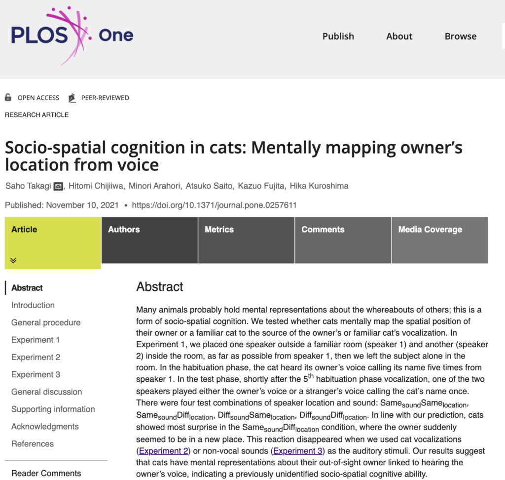 Une étude de Taho Sakagi publiée dans le journal scientifique PLOS ONE a démontré que les chats peuvent nous localiser mentalement à partir de notre voix, même lorsqu’il ne nous voient pas.