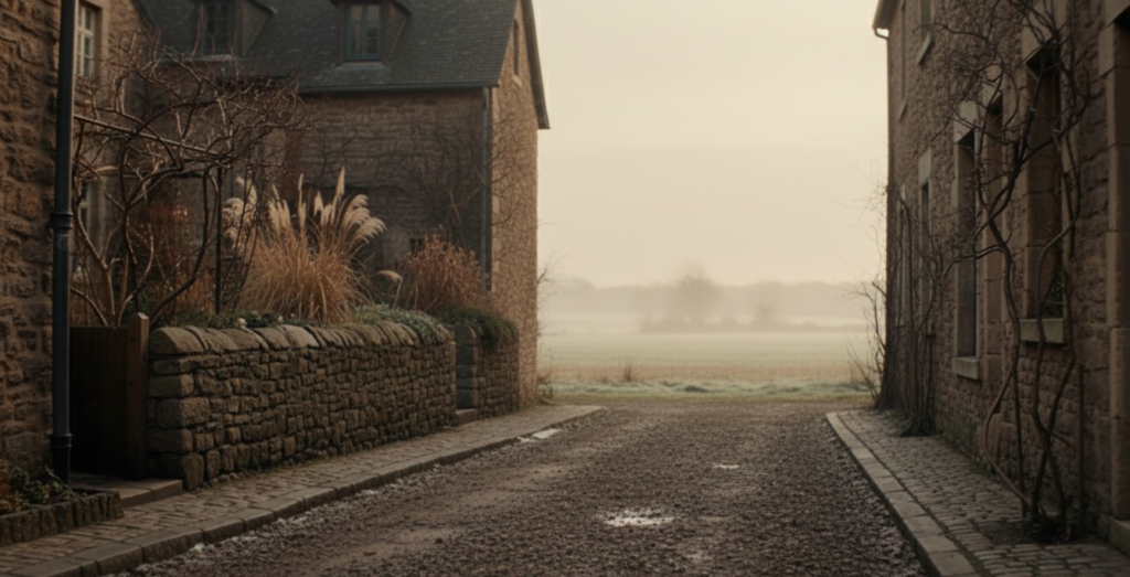 Le sol n’est plus du bitume mais un mélange de terre tassée et de gravillons. Une légère brume flotte dans un grand champ, près des maisons. Le vent porte une odeur de bois humide et de feuilles anciennes.