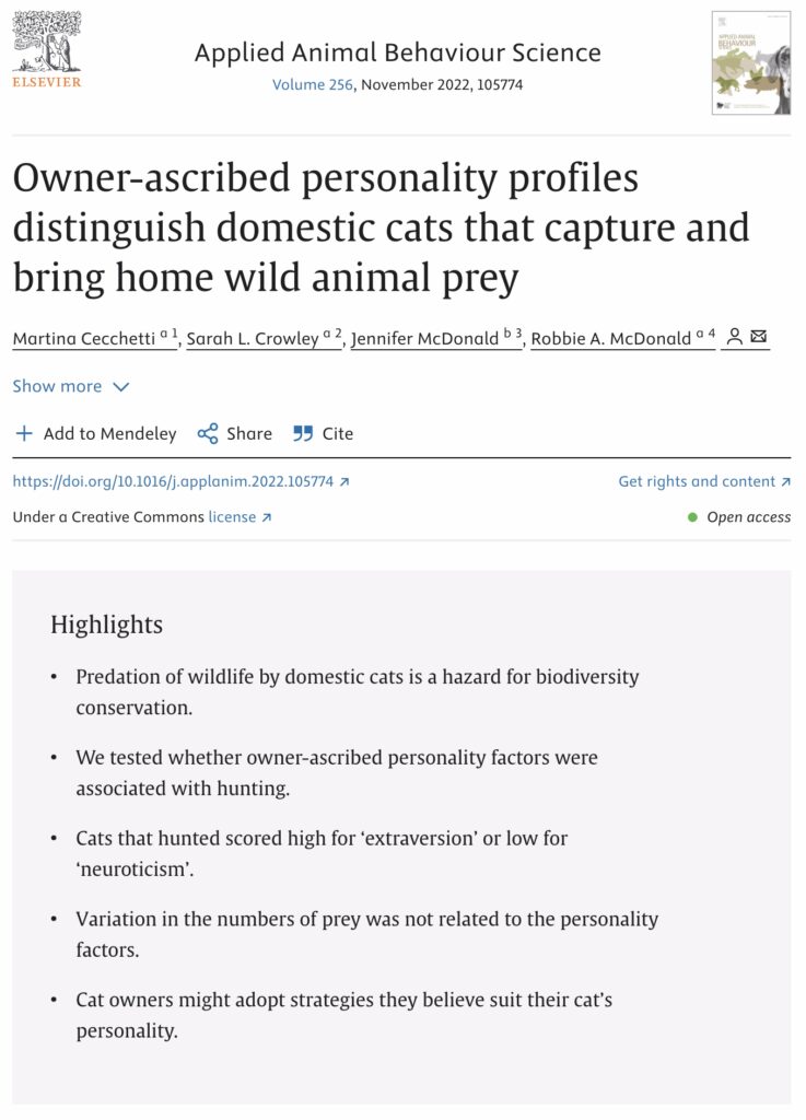 Une étude publiée en 2022 dans Applied Animal Behaviour Science a montré que la personnalité du chat influence fortement ce comportement. Les chats décrits comme plus extravertis, ou peu névrosés, chassent et rapportent plus souvent que les autres.