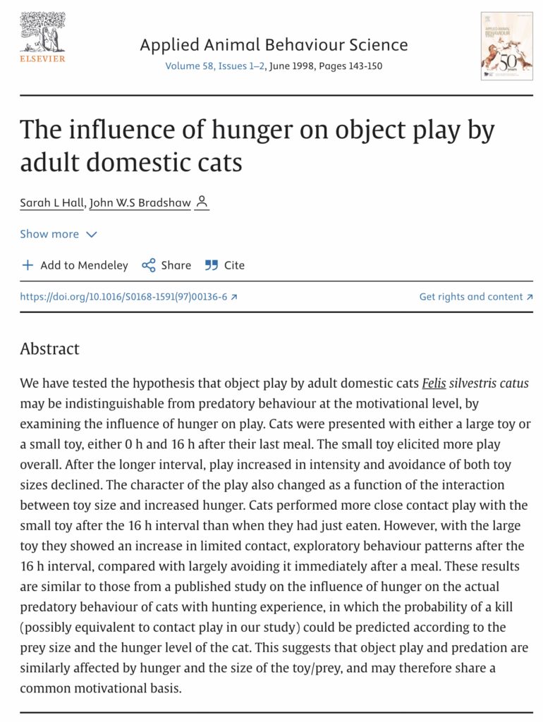 C’est pour cette raison qu’il peut rapporter quelque chose alors qu’il vient de manger ou dont il n’a pas besoin absolument. Ce point est d’ailleurs bien documenté. Une étude de référence menée par Hall et John Bradshaw en 1998 a montré que chez le chat adulte, la faim peut modifier l’intensité du comportement de chasse ou de jeu, mais pas son déclenchement.